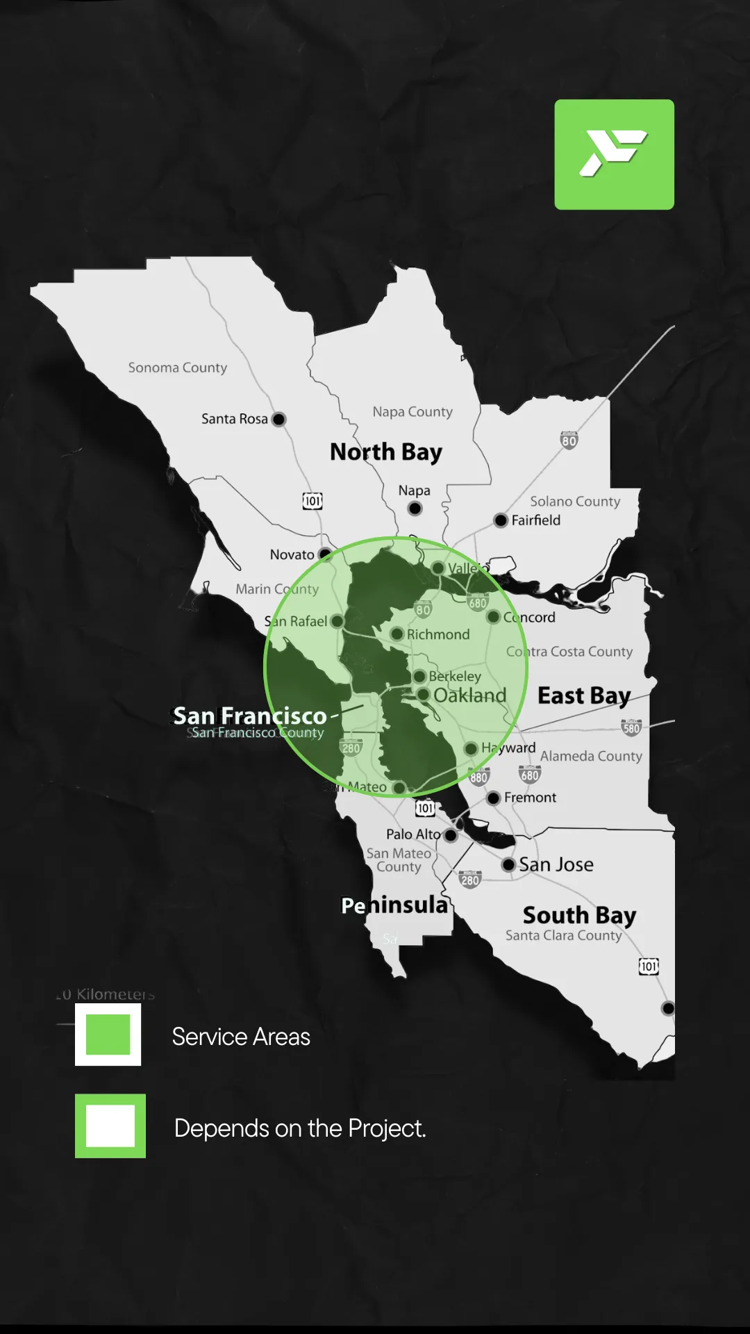 Primary service areas are highlighted. Some locations outside this area may be considered depending on the projec.